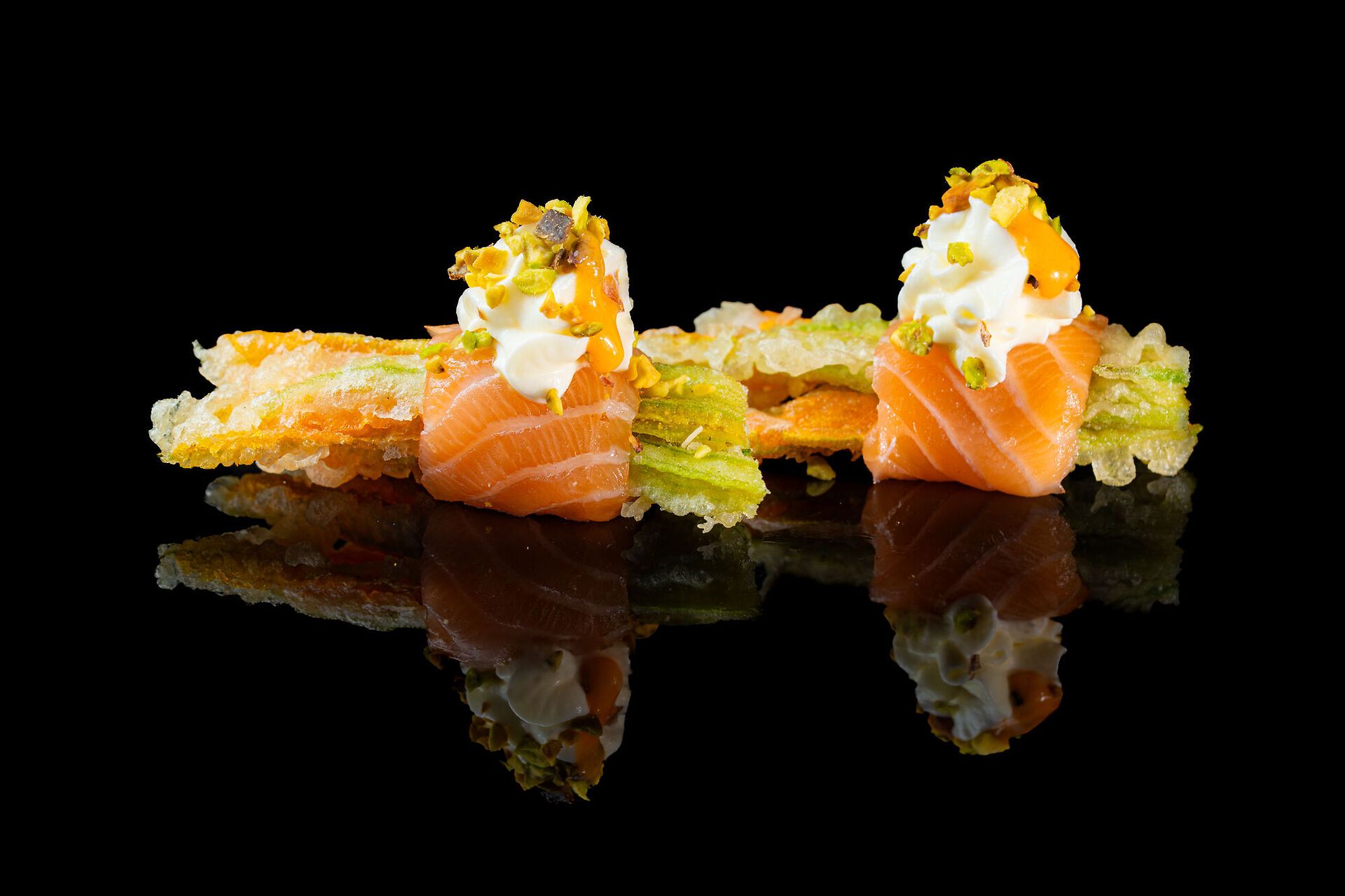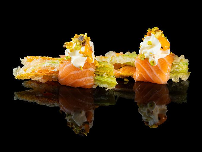 Salmone crudo, pistacchio, philadelphia, fiore di zucca fritto, salsa Teriyaki e salsa mayo spicy