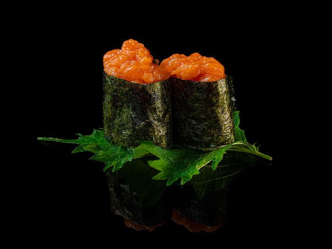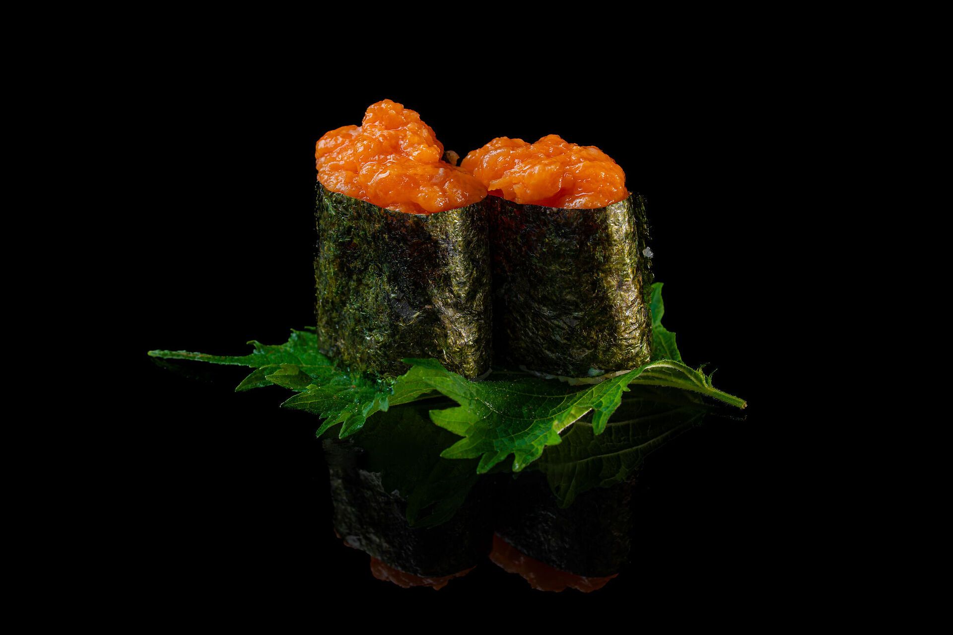 Base di riso, tartar di salmone spicy, avvolto da alga nori