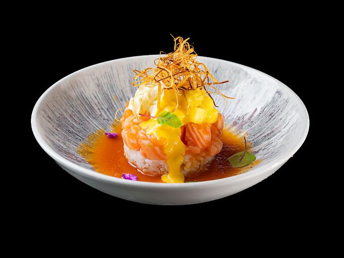 Tartare di salmone su riso bianco, mango, philadelphia, salsa mango, salsa carote e porri fritti