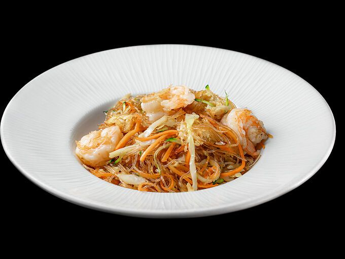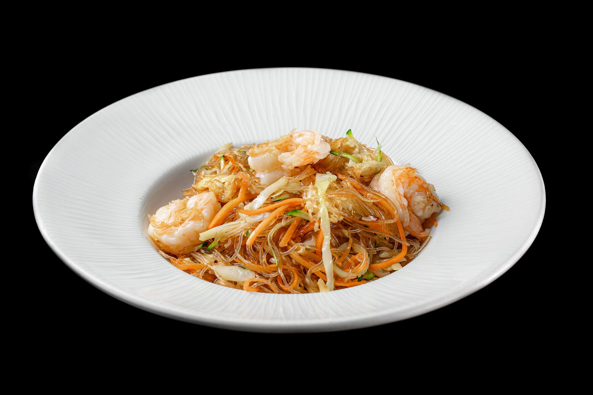 Spaghetti cinesi saltati con calamari, gamberi (mazzancolle), surimi di granchio, verdure miste e uova