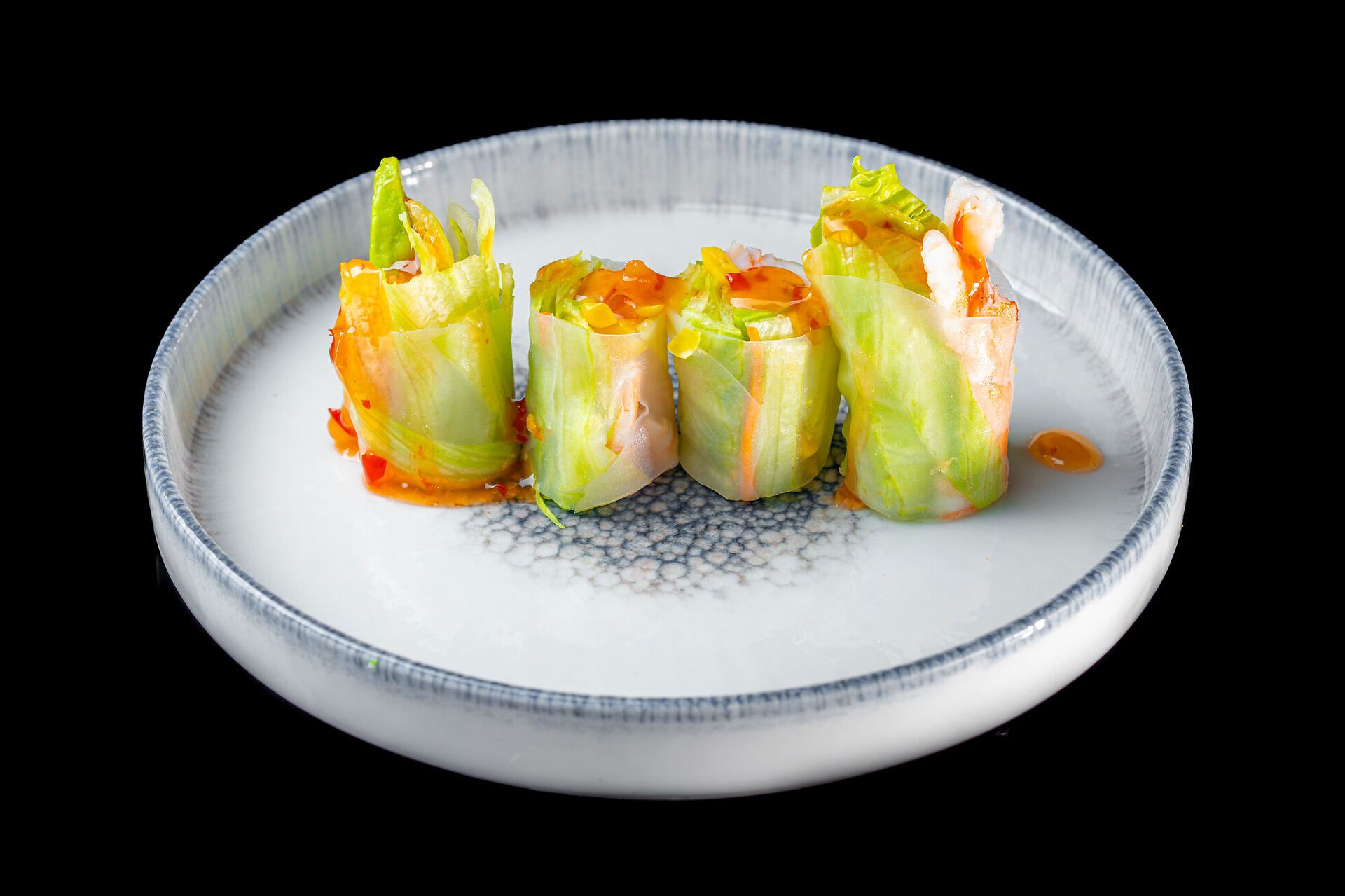Involtini freschi vietnamiti con gamberi, insalata mista, avocado, salsa agropiccante